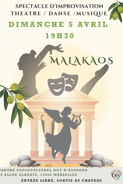Le centre socioculturel Roy d’Espagne encourage ce mélange des genres en offrant à ses adhérents une résidence qui a permis de développer un langage corporel émotionnel et musical pour proposer une forme improvisée de danse musique et comédie, MALAKAOS, aux accents de théâtre antique et de mythologie.